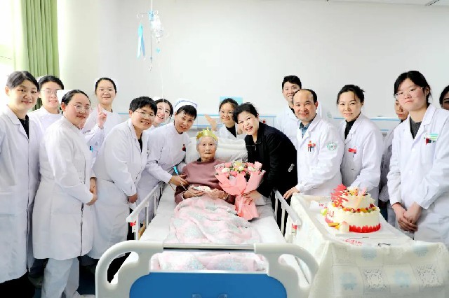 1月中旬,潘奶奶因心力衰竭入住市二院心血管內(nèi)科二病區(qū),住院期間,科室根據(jù)老人的病情制定了詳細(xì)的治療方案和護(hù)理措施,使其病情得以穩(wěn)定。在得知老人即將迎來(lái)97歲生日時(shí),病區(qū)醫(yī)護(hù)人員與患者家屬秘密策劃了這個(gè)美好的“生日派對(duì)”,為其送上美好祝愿的同時(shí),也讓老人在病房?jī)?nèi)感受到家庭的溫暖。