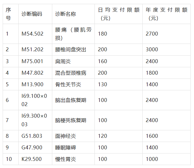 以下病種接受中醫(yī)適宜技術(shù)門(mén)診治療,可享受上述醫(yī)保報(bào)銷(xiāo)政策,具體支付限額如下(超出限額部分需個(gè)人自付):
