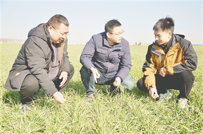 王靈光(中)和團(tuán)隊(duì)成員察看小麥苗情。