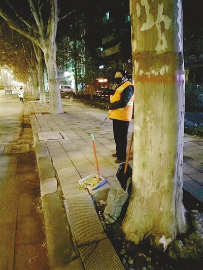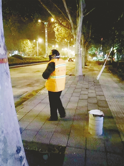 記者通過網(wǎng)友“馮馮馮馮馮好聽啊”聯(lián)系到拍攝這組照片的網(wǎng)友“微微的微笑”。她告訴記者:“11月26日晚上9點(diǎn)左右,我經(jīng)過市區(qū)黃河路與舟山路交叉口附近時(shí),看到這位環(huán)衛(wèi)工人,就拍了幾張照片。”