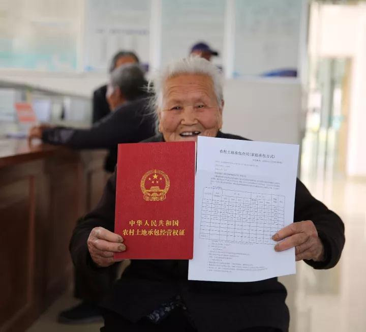 △2017年4月5日,江蘇省海安縣南莫鎮(zhèn)唐莊村1組村民丁桂英喜領《農村土地承包經(jīng)營權證》。