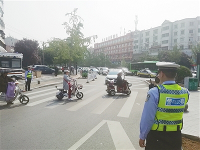 在市區(qū)大學(xué)路與嵩山路交叉口,一位輔警正在用執(zhí)法記錄儀記錄機(jī)動(dòng)車禮讓斑馬線情況。記者 楊 旭 攝