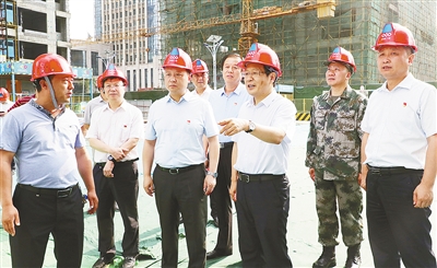 7月15日,市委書(shū)記蒿慧杰在黃山路北段察看在建工地防汛工作準(zhǔn)備情況。記者 王慶建 攝