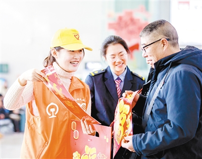 漯河西站志愿者向旅客贈(zèng)送春聯(lián)。記者 楊 光 攝