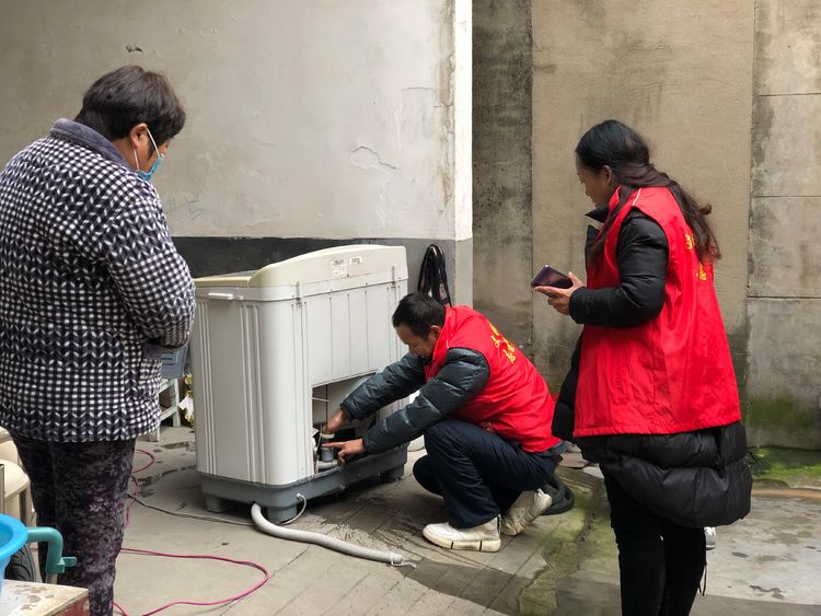 志愿者程凱亞、姚明霞到村民家中檢修洗衣機(jī)。