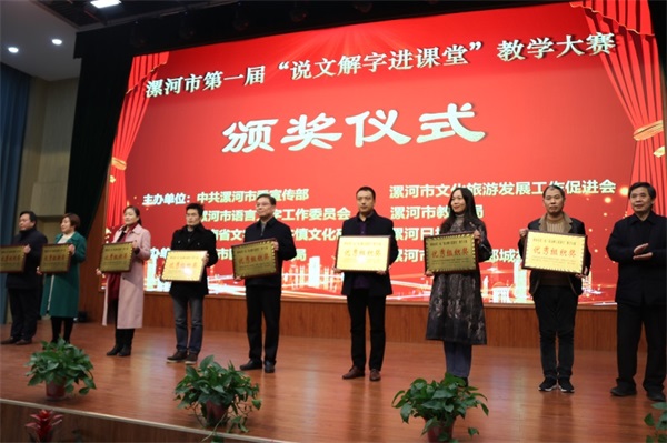 11月29日,由中共漯河市委宣傳部、漯河市文化旅游發(fā)展工作促進會,漯河市語言文字工作委員會,漯河市教育局、河南省文字學會許慎文化研究會、漯河市日報社聯(lián)合舉辦的漯河市第一屆“說文解字進課堂”教學大賽總決賽及頒獎典禮在漯河市郾城中學舉行。郾城中學東校區(qū)教師常賽男獲得“說文解字進課堂”教學大賽初中組一等獎,郾城區(qū)實驗小學曹艷紅獲得“說文解字進課堂”教學大賽小學組一等獎,郾城區(qū)教育局、郾城中學均獲得“說文解字進課堂”教學大賽優(yōu)秀組織獎