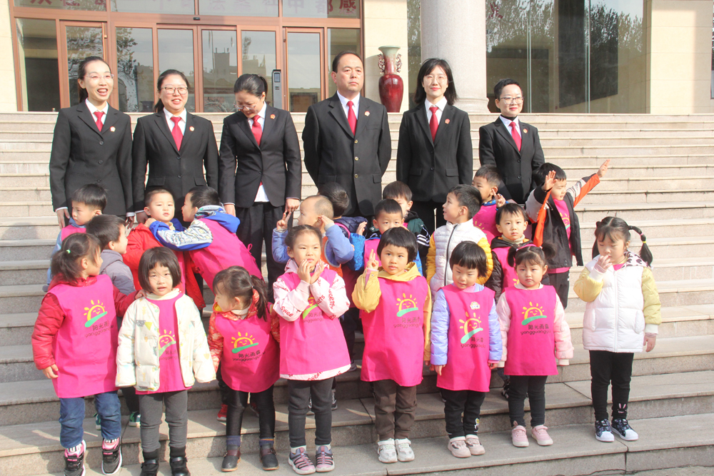 (中院法官和陽(yáng)光雨露幼兒園小朋友在大樓門前留影)