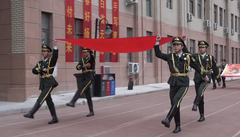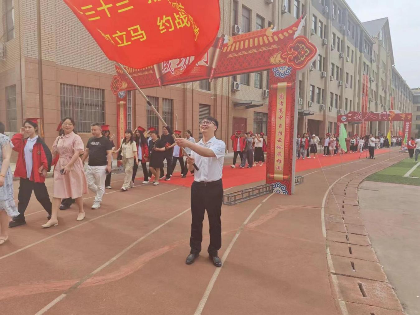 在雄壯激昂的國(guó)歌聲中,國(guó)旗班同學(xué)護(hù)送國(guó)旗緩緩入場(chǎng),高三年級(jí)必勝旗緊隨其后。