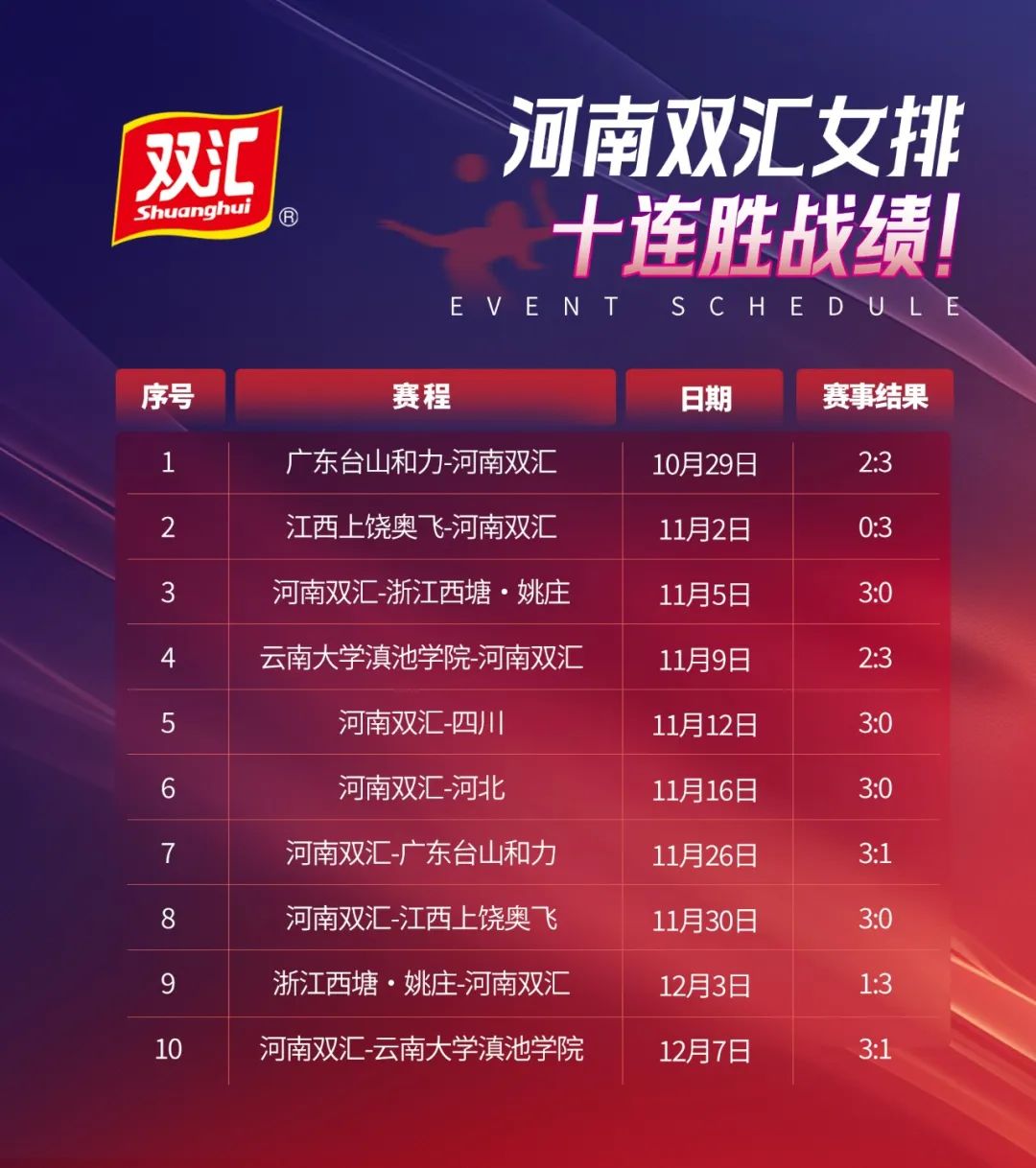 經(jīng)過多年的培養(yǎng)和訓(xùn)練,河南雙匯女排打造出了自己快速多變、通力合作、更強(qiáng)更穩(wěn)的戰(zhàn)術(shù)風(fēng)格,形成了一支技術(shù)過硬、敢打敢拼、團(tuán)結(jié)向上的專業(yè)球隊(duì)。本屆排球超級(jí)聯(lián)賽開賽以來,雙匯在賽場(chǎng)內(nèi)外全程暖心陪伴,一方面,現(xiàn)場(chǎng)設(shè)置了雙匯美食補(bǔ)給站,向女排隊(duì)員和廣大觀眾提供各類健康美食,主要有簡頌單片午餐肉、鮮雞蛋棒、金馬克、爆汁香腸等;還定制發(fā)放氣氛棒、員工觀賽方陣以及設(shè)置提振勢(shì)氣、鼓勁加油的標(biāo)語口號(hào)等,滿滿的健康美味和精神給養(yǎng),全程賦能河南雙匯女排,助力隊(duì)員們豪取十連勝,見證她們創(chuàng)下了本賽季中國女排超級(jí)聯(lián)賽的一項(xiàng)紀(jì)錄,即成為了所有參賽隊(duì)中唯一一支保持全勝的球隊(duì)。