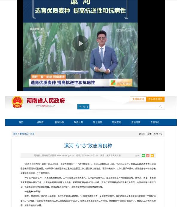 2024年,在市級(jí)以上媒體宣傳報(bào)道90余篇?!秾?zhuān)“芯”致志育良種》被省政府官網(wǎng)報(bào)道,科技服務(wù)春耕春管工作被《河南日?qǐng)?bào)》《科技日?qǐng)?bào)》報(bào)道,《選育優(yōu)質(zhì)麥種提高抗逆性和抗病性》小麥新品種選育工作4月26日被央視報(bào)道。