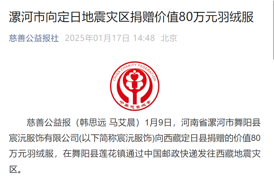 1月9日,河南宸沅服飾有限公司總經(jīng)理李書鋒聯(lián)系市縣慈善總會(huì),捐贈(zèng)價(jià)值80萬元的羽絨服,通過中國(guó)郵政快遞專車發(fā)往西藏災(zāi)區(qū)。