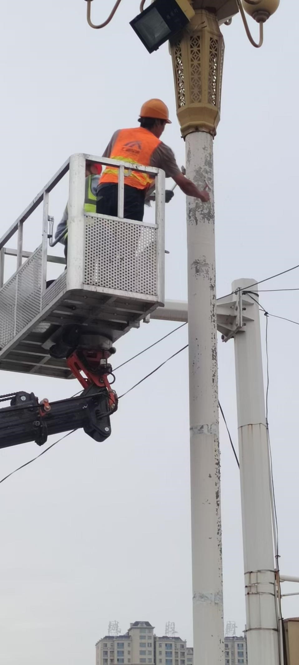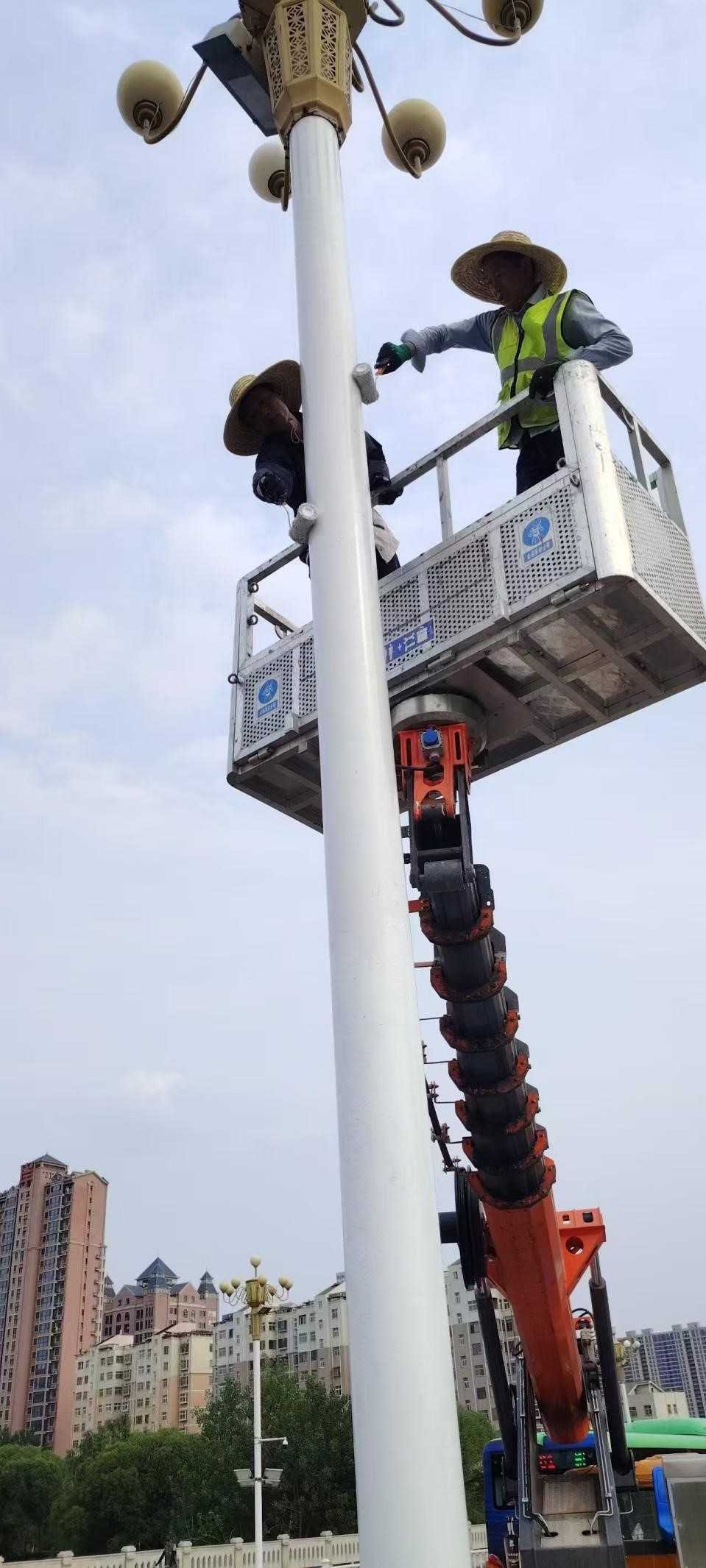 針對(duì)橋梁燈桿位于河道之上,和環(huán)境潮濕的特點(diǎn),此次燈桿刷漆特別選用丙烯酸聚氨酯面漆,使其抗氧化耐腐蝕,耐候性更強(qiáng)。在施工中,工作人員使用高空作業(yè)車升空至10余米高度操作,在全面做好安全措施的基礎(chǔ)上,盡量減少對(duì)市民出行的影響,采取早上和傍晚作業(yè)的方式,在適宜油漆作業(yè)的溫度進(jìn)行刷漆作業(yè),期間市政人員不畏高空、風(fēng)大等因素,在盡量保護(hù)原鍍鋅膜的基礎(chǔ)上,先對(duì)脫漆銹蝕部位進(jìn)行清理,再對(duì)燈桿進(jìn)行打磨除塵,著重對(duì)銹點(diǎn)部位涂刷防銹漆后再對(duì)整桿燈桿進(jìn)行刷漆。
