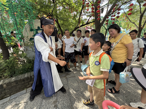 一踏入萬歲山武俠城,古色古香的宋代街巷和建筑便映入孩子們眼簾,仿佛穿越回了千年前的大宋。街道上,鄭記肉鋪、獅子樓、王婆茶莊等實景店鋪,充滿生活氣息,孩子們好奇地打量著,想象著古人的生活場景。街邊藝人的精彩表演引得孩子們陣陣驚嘆,歡呼聲此起彼伏?!度蜃<仪f》里,逼真的城墻、城門、大炮和烽火臺,激烈的戰(zhàn)斗場面配合影視爆破、云梯炮戰(zhàn)、大型馬術等實景拍攝技術,將《水滸傳》中的情節(jié)鮮活呈現(xiàn),孩子們看得目不轉(zhuǎn)睛,被綠林好漢們的江湖豪情深深吸引,演出結束后,掌聲雷動。在萬歲山武俠城內(nèi),孩子們還觀賞了多場精彩絕倫的演出。從《吊環(huán)》的驚險特技到《大宋奇兵》的英勇無畏,再到《李逵斷案》和《林沖戰(zhàn)楊志》……此外,孩子們還進行了一系列互動體驗活動。通過石頭剪刀布、投壺等游戲來賺取銀票,換取自己喜歡的物品。每一場演出都讓孩子們陶醉其中,流連忘返。