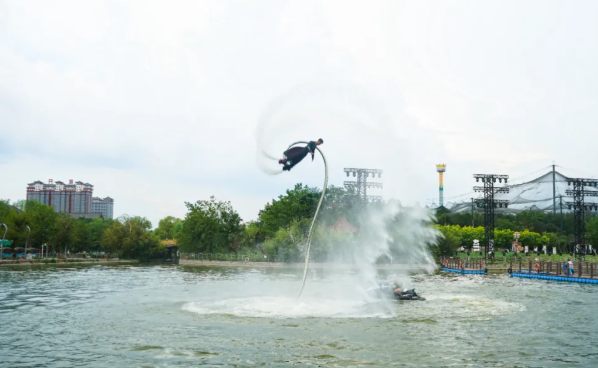 水上表演更是精彩絕倫?!丢氈袼掀饭?jié)目中,表演者們腳踩楠竹,在水面上輕盈滑行,仿佛在水上飛舞,引得觀眾們驚嘆不已?!端巷w人》的表演者們借助噴水裝置在空中翻轉騰挪,如同超人般翱翔于水面之上;而《水上火壺》則將傳統(tǒng)藝術與現代科技完美結合,火光與水花交相輝映,震撼的視覺效果讓觀眾們忍不住發(fā)出陣陣喝彩和尖叫。鳳棲湖劇場內,大型舞臺劇《時空奇緣》的現場排練預演同樣精彩,演員們精湛的表演和動人的故事引得觀眾掌聲雷動,沉浸其中。
