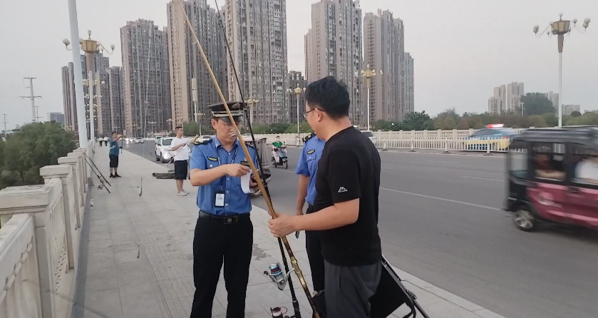 城管隊員對占用橋面違規(guī)釣魚者進行處罰