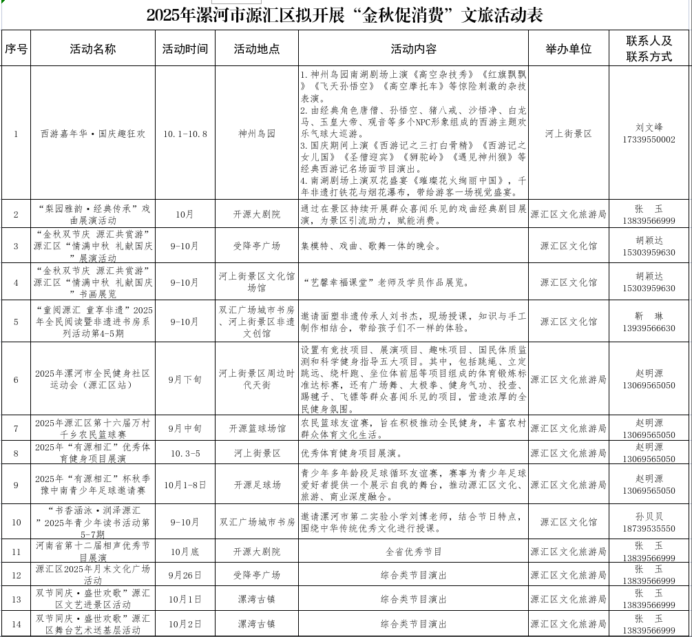 為深入貫徹落實(shí)國家、省、市關(guān)于促進(jìn)文旅消費(fèi)的決策部署,進(jìn)一步激發(fā)全區(qū)文旅市場活力、提振消費(fèi)信心、點(diǎn)燃群眾消費(fèi)熱情,拉動文旅消費(fèi)增長,源匯區(qū)文旅局采取三項(xiàng)有力措施,精心籌備并扎實(shí)推進(jìn)金秋文旅消費(fèi)季活動。