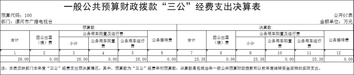 2020年度“三公”經(jīng)費(fèi)財政撥款支出決算中,因公出國(境)費(fèi)支出決算0萬元;公務(wù)用車購置及運(yùn)行費(fèi)支出決算25.38萬元,完成預(yù)算的97.62%,占100.0%;公務(wù)接待費(fèi)支出決算0.00萬元。具體情況如下: