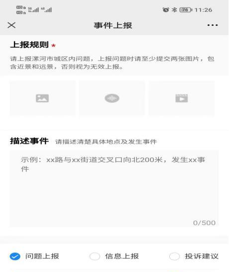 在公眾號主頁左下方點擊“問題上報”專欄,然后選擇“隨手拍”欄,按照規(guī)則提示進行操作。