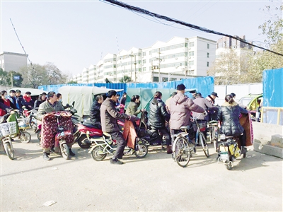 11月30日下午1點,記者來到解放路南段東貨場處的鐵路道口北側,看到鐵道已經(jīng)被藍色圍擋圍了起來,在靠東側的位置留了一個寬約2米的出入口。在出入口處,擠擠攘攘地圍著20多輛電動車、三輪車、老年代步車等車輛,車主或坐在車上,或下車等待,耐心地等待著能夠通行。一些沒有耐心的車主,選擇調頭繞行,還有個別車主拿出手機打發(fā)時間。在鐵道口南側,等待通行的行人、車輛則排起了長隊。