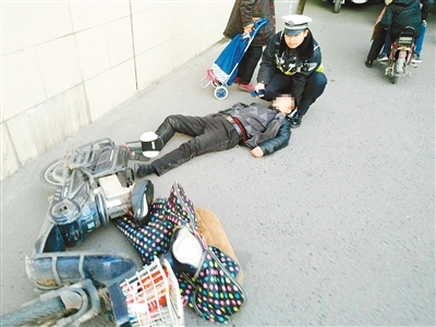 由于圍觀群眾越來越多,隨后趕來的幾名輔警一邊疏散人群、一邊疏導交通。張斌怕男子頭躺在地上太涼,就一直用手托著他的頭。