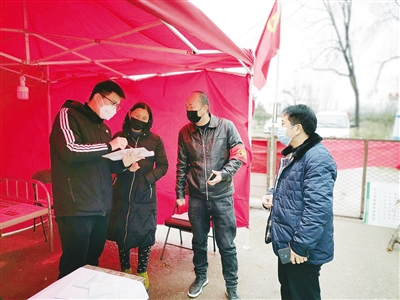 王航(左一)在防控卡點(diǎn)檢查人員登記情況。王航供圖
