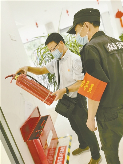 吳國(guó)安(左)正在銀行營(yíng)業(yè)大廳檢查滅火器。