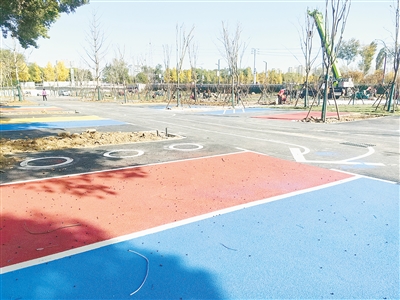 這里的建筑拆除后,已經(jīng)修建了停車場、小公園和道路。停車場有近50個車位,分別涂上了紅、黃、藍(lán)、綠等不同的顏色,每隔幾個車位有樹木和草坪。各種指示箭頭、標(biāo)識也施劃完畢。