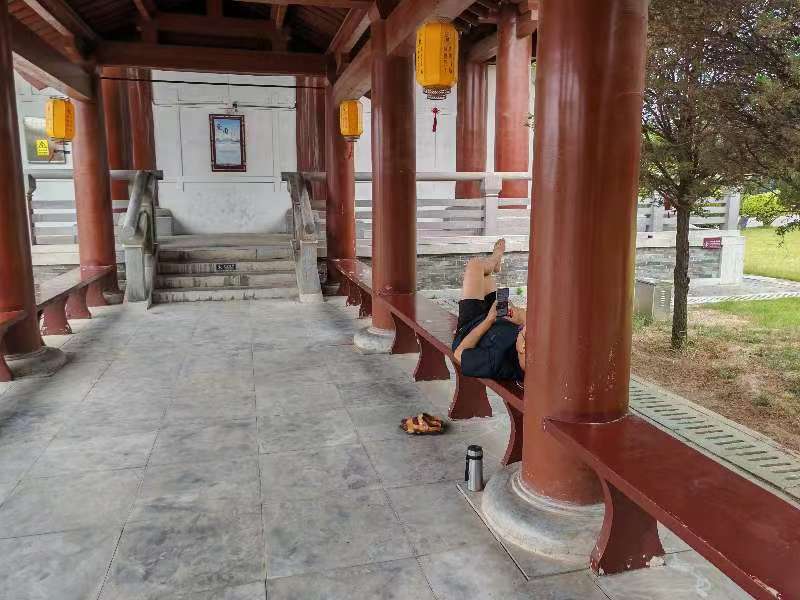 許慎文化園,這位游客光腳躺在長廊下不文明