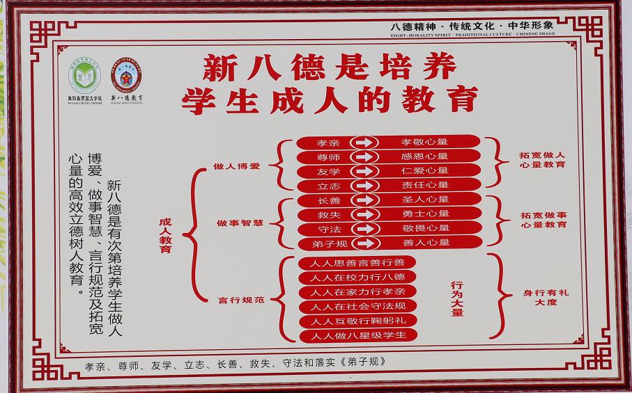 德育是學校教育的靈魂,是學生健康成長和學校工作的保障,德育的質量是學校辦學水平的重要標志之一,把德育擺到優(yōu)先發(fā)展的位置,能讓學生受益一生,得益一世!為此,朱喜洋把“新八德”作為德育教育之基之核,他認為,抓住了“新八德”,就牽住了德育教育的牛鼻子。