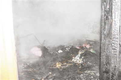 經(jīng)過40分鐘,大火最終被撲滅,但失火臥室內(nèi)的擺設(shè)已化為灰燼。房間內(nèi)一片狼藉,墻壁被熏得烏黑,臥室的門也被燒焦,大火已經(jīng)蔓延到了走廊,但由于撲救及時(shí),才沒有釀成更大損失。