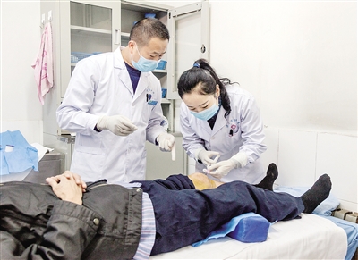 1月8日上午,在市中醫(yī)院針灸推拿科的一間病房里,多位醫(yī)務(wù)人員忙碌而認真地扎針、拔罐、推拿、電療、牽引……
