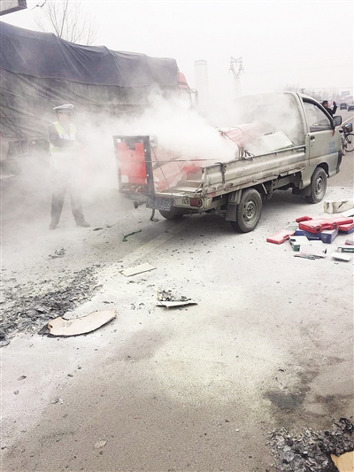 3月12日中午,何先生開著一輛單排小貨車,去臨潁縣北環(huán)路送貨,行至107國道時(shí),車上突然起火,頓時(shí)黑煙滾滾。“車上拉的是塑料制品和車用工具制品,還有一桶9升液壓油,貨物價(jià)值6萬多元。”何先生說,他看見火苗躥起,當(dāng)時(shí)就嚇得六神無主,心驚膽戰(zhàn)。