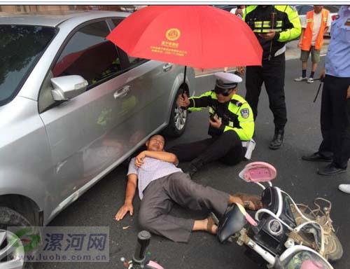 漯河市交警支隊(duì)秩序管理示范大隊(duì)騎警吳沛洋:當(dāng)時(shí)我跟隊(duì)友王冰潔巡邏到嵩山西支路的時(shí)候,發(fā)現(xiàn)一場(chǎng)車(chē)禍,我們立即上去查看,當(dāng)時(shí)發(fā)現(xiàn)地上躺了一位六十多歲的老人,經(jīng)過(guò)簡(jiǎn)單的詢(xún)問(wèn)老人出現(xiàn)了頭暈,胸悶的癥狀,根據(jù)經(jīng)驗(yàn)確定他有可能是心臟病,因?yàn)楫?dāng)時(shí)天氣溫度較高, 地表溫度可能要達(dá)到四十多度,老人心臟病不能移動(dòng),只能平躺,我就把老人的頭稍微抬起來(lái)一點(diǎn),由于沒(méi)有支撐點(diǎn),情急之下我就坐在地上伸出腿,讓老人枕著我的腿,等待120的救援。