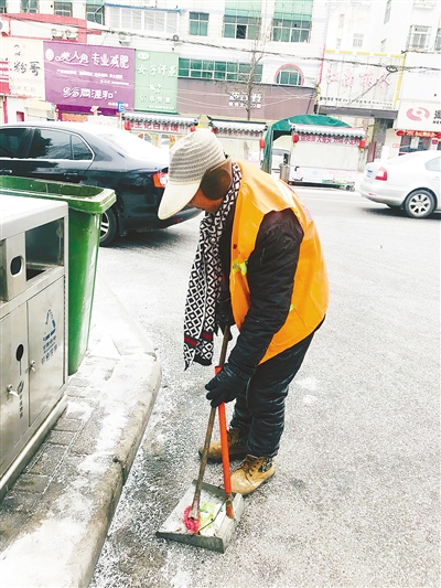 2月10日上午,室外氣溫很低,天空飄著雪花,記者在市區(qū)黃河西路見(jiàn)到了正在保潔路面的環(huán)衛(wèi)工人肖中周。皮手套、耳暖、圍巾、帽子,雖然他全副武裝,可仍抵不住這冬日的嚴(yán)寒,臉頰被凍得通紅。他告訴記者,凌晨4點(diǎn)他就起床到達(dá)了自己負(fù)責(zé)的路段,開(kāi)始打掃路面。過(guò)年期間,為了保證路面的干凈整潔,他和負(fù)責(zé)該路段的另一名環(huán)衛(wèi)工輪流值班。