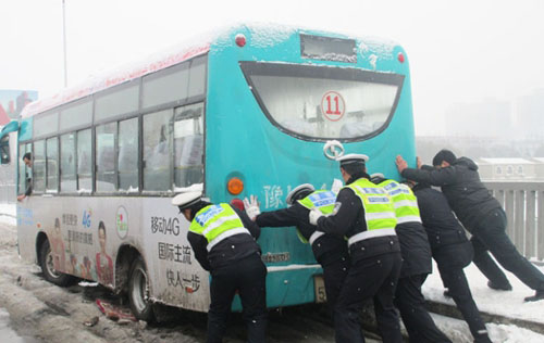 春節(jié)下雪期間 漯河交警一天內(nèi)幫忙推車70多臺