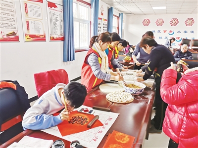 活動開始前,社區(qū)共建單位漯河市實驗中學(xué)的老師和學(xué)生們進(jìn)行了寫春聯(lián)、送春聯(lián)活動,社區(qū)志愿者則在一旁包餃子。