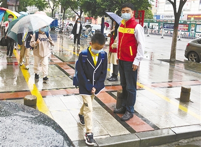 “路上小心,不要扎堆,注意間隔一米以上……”5月7日下午,天下著蒙蒙細(xì)雨,在源匯區(qū)受降路小學(xué)門口,身穿紅馬甲的馮濤不時(shí)提醒排隊(duì)放學(xué)的學(xué)生注意間隔距離。一些學(xué)生路過時(shí),主動(dòng)向馮濤問好、鞠躬。