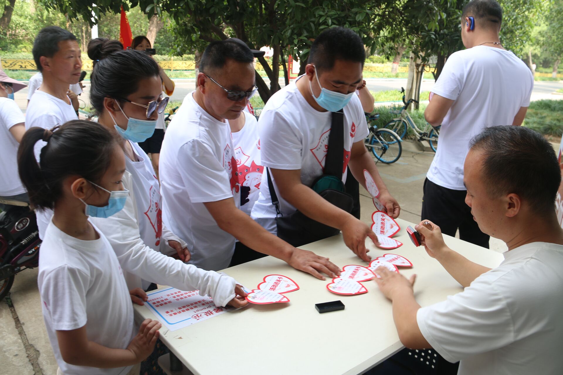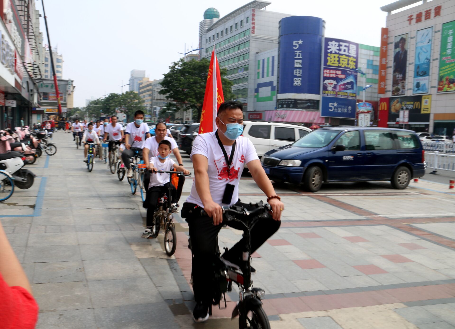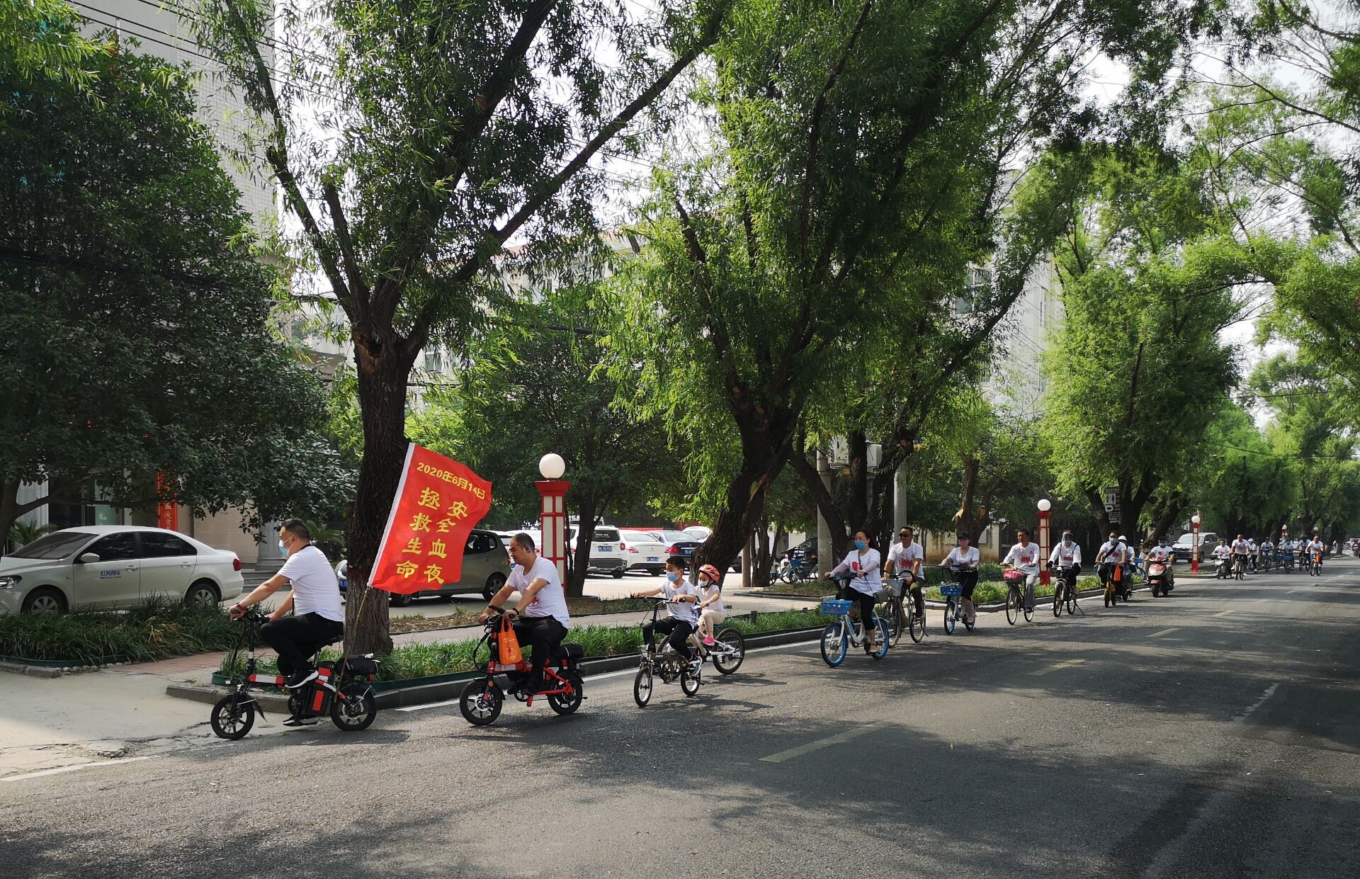 6月14日上午9時,志愿者們身穿統(tǒng)一服裝,車上綁上小紅旗,分多個小組從市區(qū)解放路006號獻血屋出發(fā),沿市內(nèi)主要干道依次到昌建廣場南獻血屋、沙北獻血屋、黃河廣場獻血屋與宣傳海報合影留念打卡簽到,最終到交通路001號獻血屋終點站完成全部騎行打卡路線。幾十米長的騎行隊伍,吸引路人、商鋪店員等矚目觀望,成為我市街頭一道靚麗的風(fēng)景線。