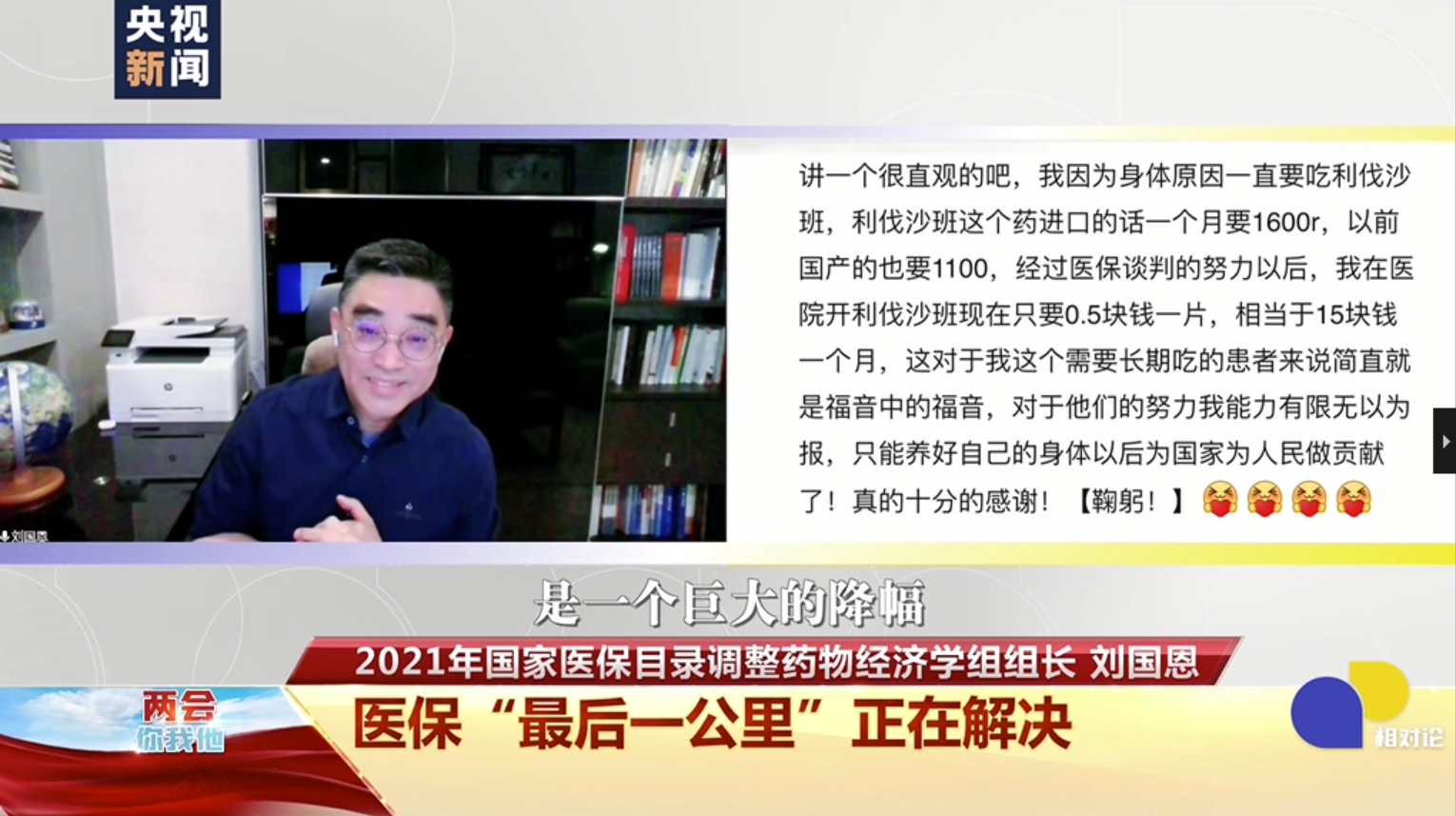 劉國(guó)恩:看到這些評(píng)論,肯定是非常欣慰的,非常非常欣慰。國(guó)家醫(yī)保局成立以來,在醫(yī)保目錄準(zhǔn)入談判、藥品集中帶量采購(gòu)等方面做了很多工作,確實(shí)大大減輕了患者的經(jīng)濟(jì)負(fù)擔(dān)。與此同時(shí),從長(zhǎng)遠(yuǎn)來看的話,國(guó)家支付能力、個(gè)人支付能力,不斷提高才是根本。說一千道一萬,最根本還是如何把我們中國(guó)的經(jīng)濟(jì),更好地、持續(xù)地、穩(wěn)定地,推向越來越好的增長(zhǎng)水平。