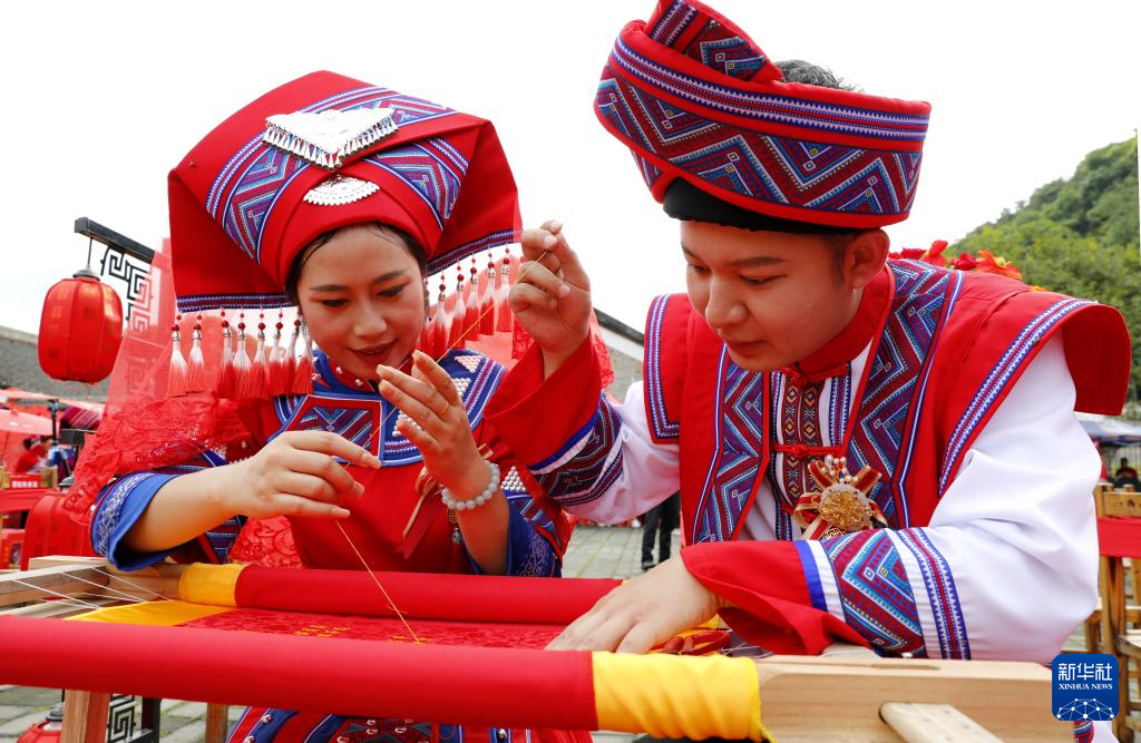 5月20日,在廣西忻城縣“520”集體婚禮現(xiàn)場(chǎng),一對(duì)新人一起繡婚書(shū)。