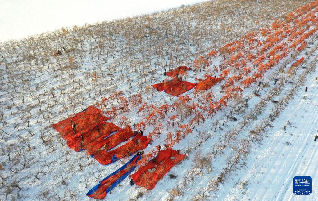 12月16日,黑龍江北大荒農(nóng)業(yè)股份有限公司友誼分公司的種植戶在采收沙棘果(無人機照片)。