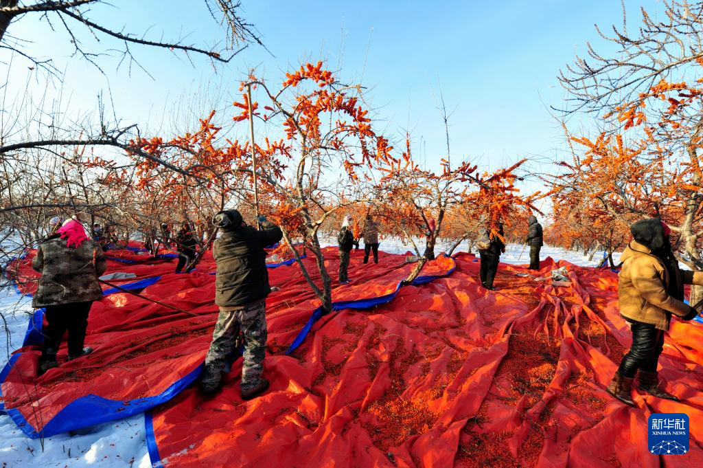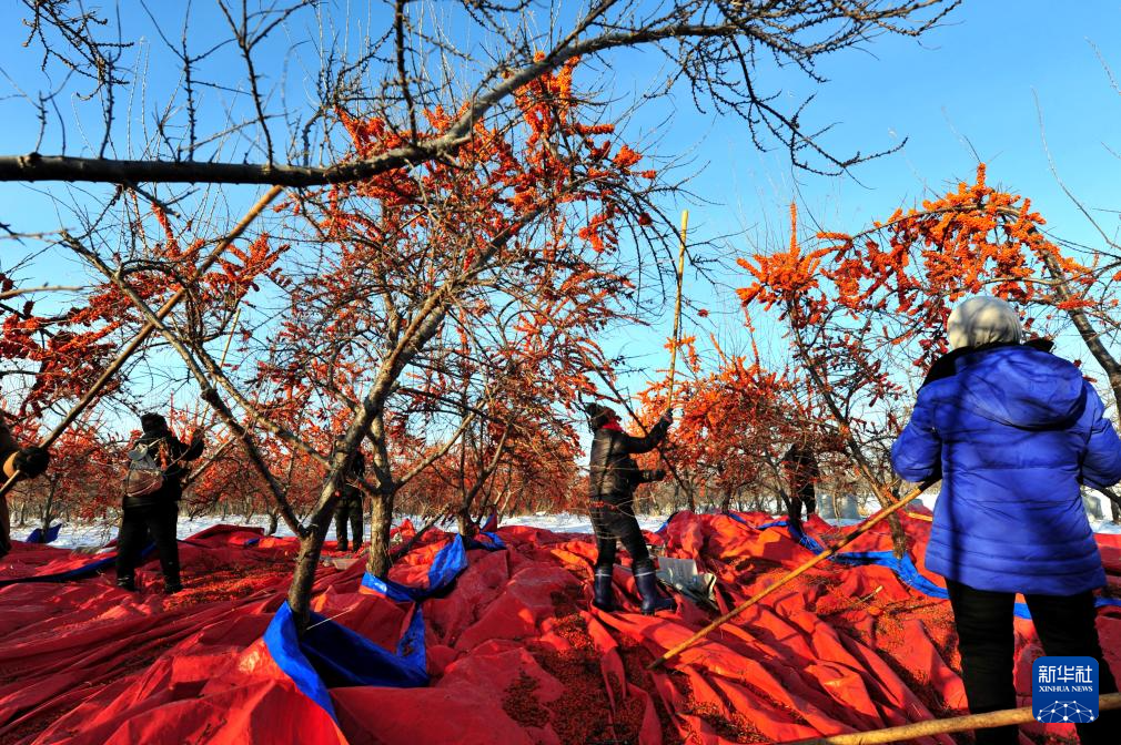 12月16日,黑龍江北大荒農(nóng)業(yè)股份有限公司友誼分公司的種植戶在采收沙棘果。