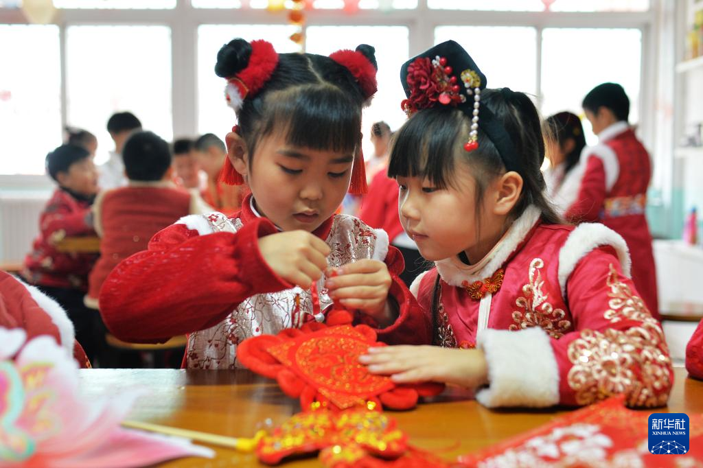 1月14日,在山東青島北仲路第二小學(xué)開(kāi)展的“國(guó)風(fēng)古韻”迎新春主題活動(dòng)上,兩名學(xué)生在給中國(guó)結(jié)固定線繩。
