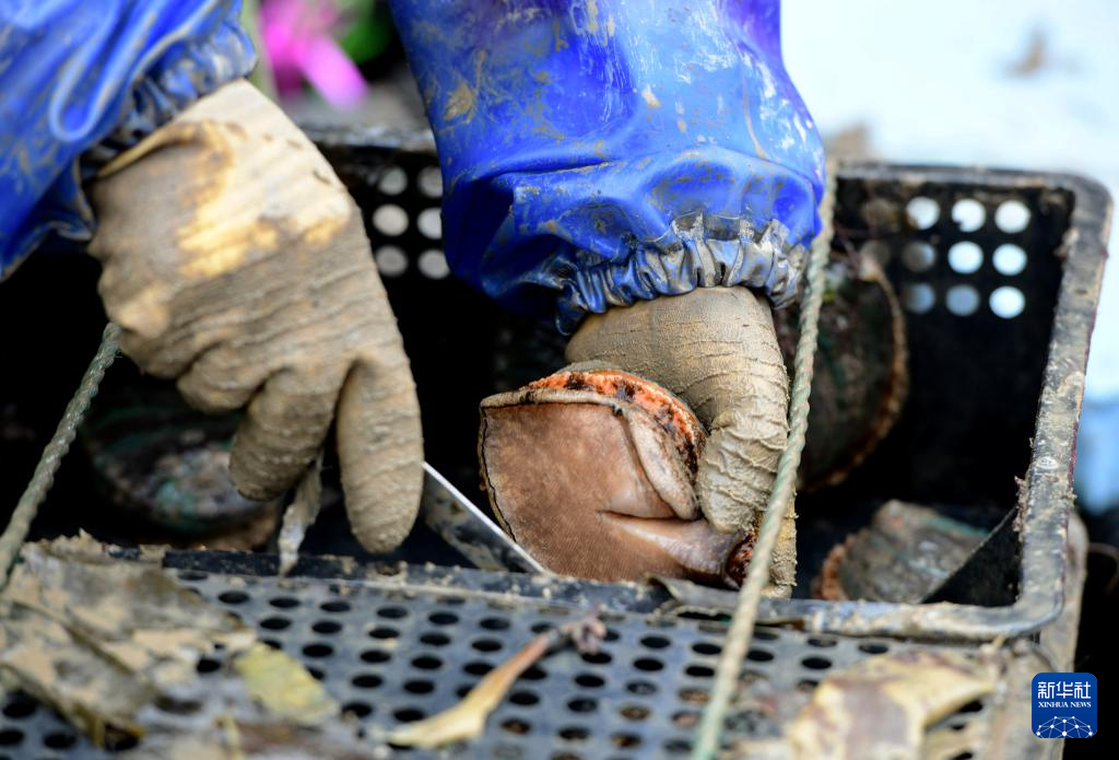 在莆田南日島海域碼頭,漁民抓緊采收剛收獲上岸的大規(guī)格鮑魚(2月27日攝)。