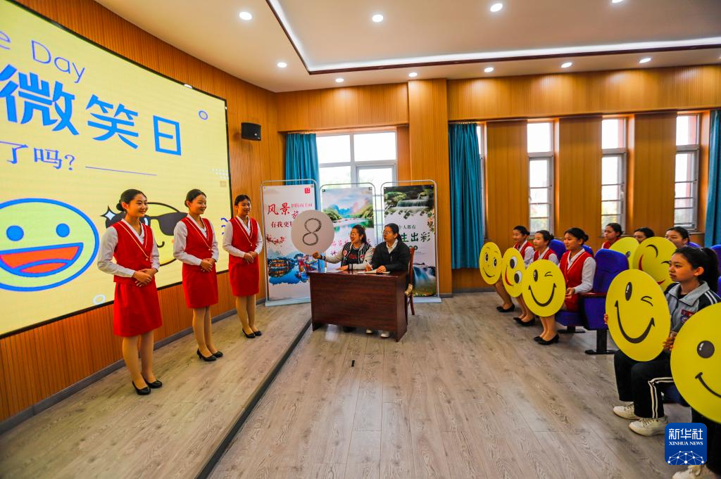 5月7日,河北省遵化市職教中心旅游專業(yè)的學(xué)生在參加微笑禮儀展示活動。