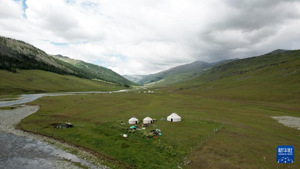 7月2日,在新疆阿勒泰市野卡峽,剛剛轉(zhuǎn)場而來的牧民們已搭建好氈房(無人機(jī)照片)。
