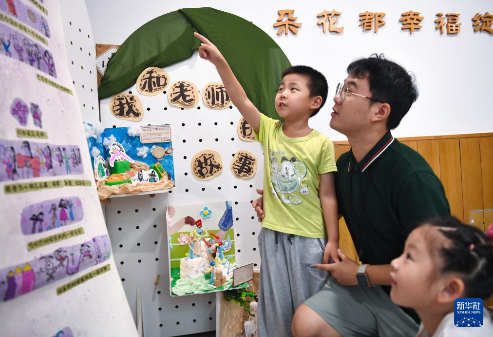 9月9日,在南京新世紀實驗幼兒園,小朋友給老師講述自己創(chuàng)作的“我和老師的故事”。