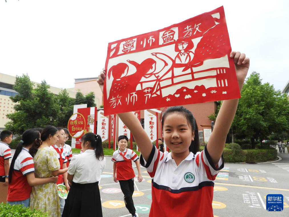 9月9日,四川達州高新區(qū)實驗學校學生展示獻給老師的創(chuàng)意剪紙作品。