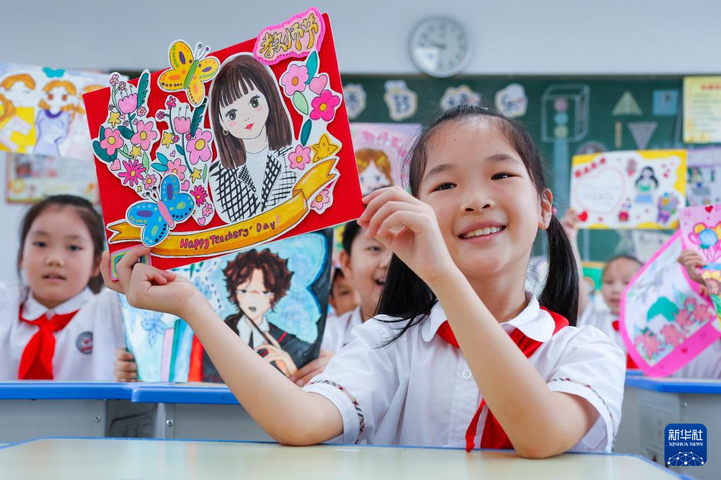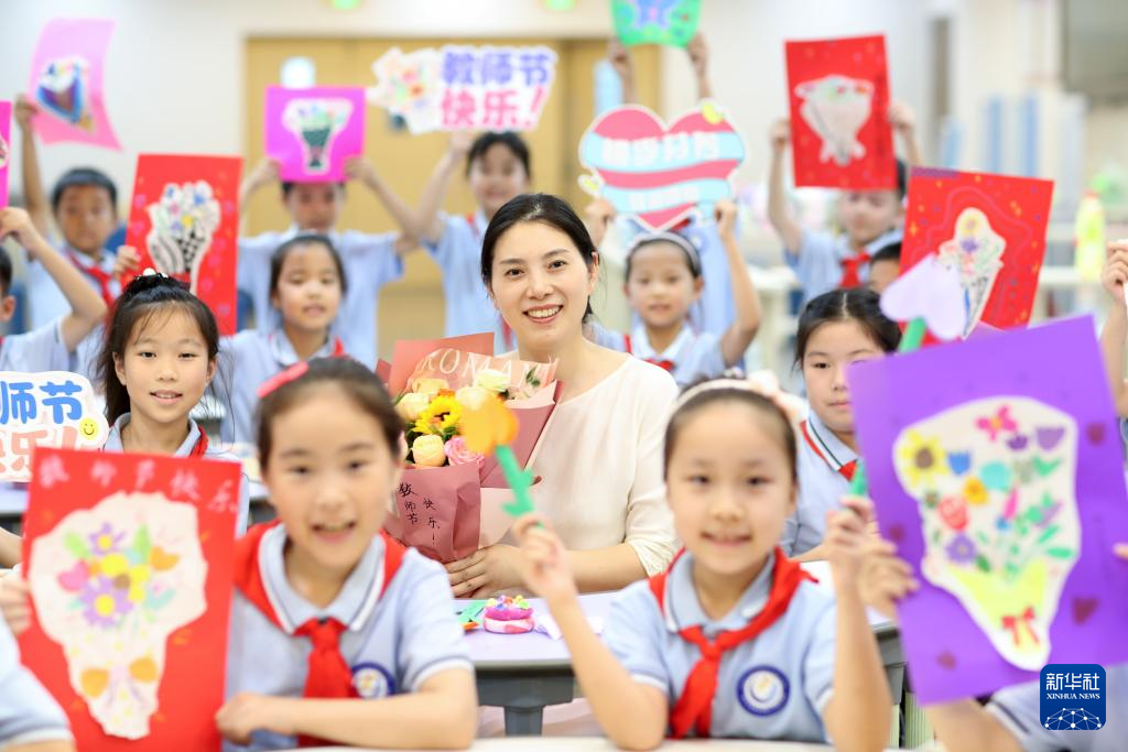 9月9日,在武漢市未來實驗小學美林校區(qū),學生為教師送上節(jié)日祝福。