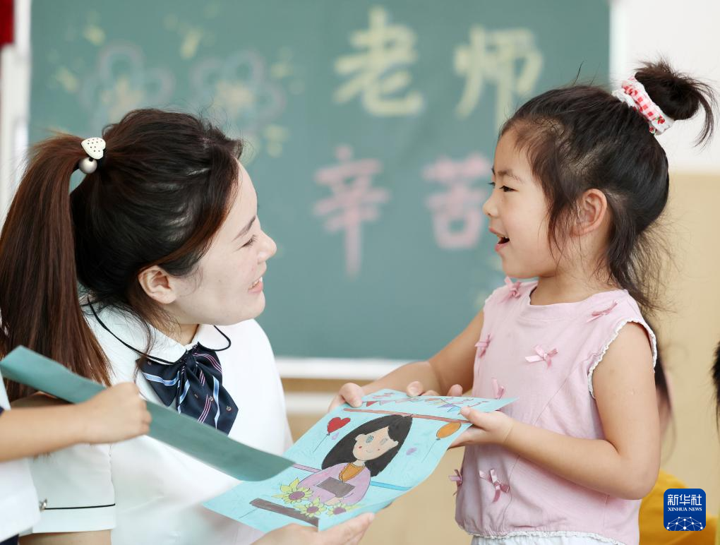 9月9日,山東省臨沂市郯城縣郯城街道官塘幼兒園的孩子將在老師的指導幫助下制作的繪畫送給老師。